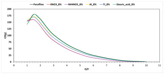 Figure 3 presents the variation in the amount of carbon monoxide (CO), expressed in grams per 100 g of fuel, as a function of the oxidizer-to-fuel (O/F) ratio for pure paraffin and paraffin with 8% additions of KNO3, NH4NO3, Al, Ti, and stearic acid. The simulations were performed using ProPEP at a chamber pressure of 10 bar.