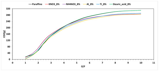 Variation of CO2 quantity per 100 g of fuel as a function of oxidizer-to-fuel ratio, obtained through ProPEP Version 1.0.3.0 software simulations for pure paraffin and paraffin with 8% additions of KNO3, NH4NO3, Al, Ti, and stearic acid.