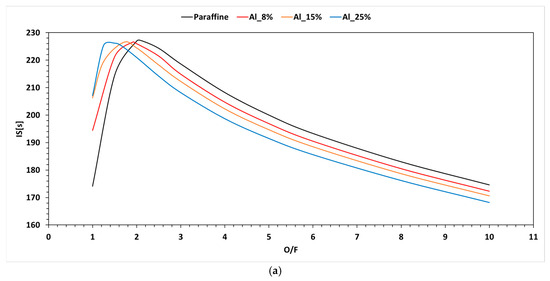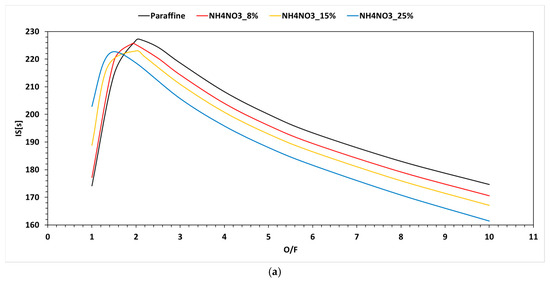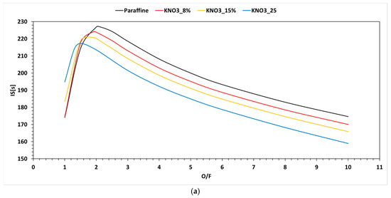 Figure 1 presents the variation of specific impulse as a function of the oxidizer-to-fuel ratio for pure paraffin and paraffin with 8% additions of KNO3, NH4NO3, Al, Ti, and stearic acid.