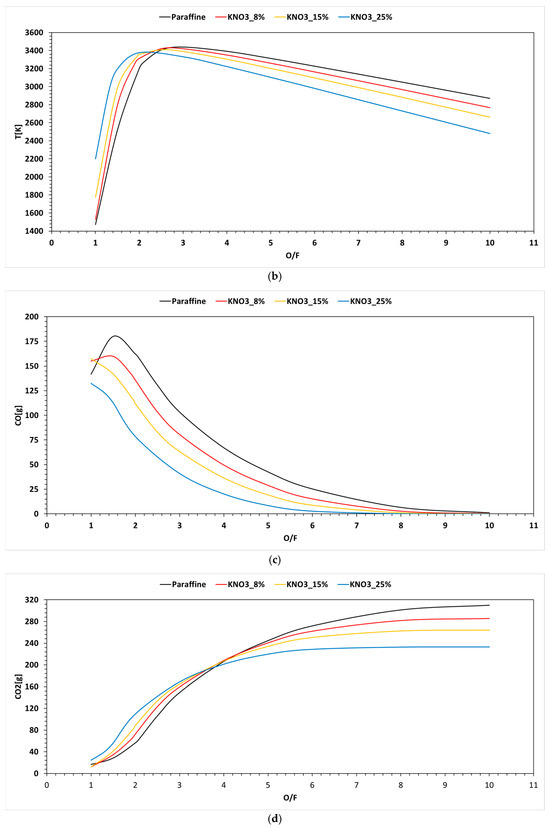 The maxima for both specific impulse and combustion temperature occur in the range of O/F ≈ 2.1–2.3, slightly shifting leftward as the KNO3 content increases (e.g., at 25% KNO3, the peak is closer to O/F ≈ 2.0). CO emissions display a local peak around O/F ≈ 2.2, followed by a sharp decline with increasing O/F ratio. In contrast, CO2 emissions rise almost monotonically with O/F and reach their highest values around O/F = 10, where combustion is nearly complete.