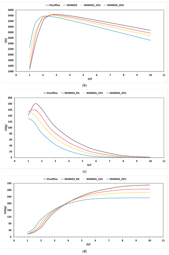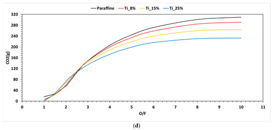 The highest CO2 emissions are recorded for paraffin with stearic acid (≈280 g CO2 at O/F = 10), indicating complete and efficient combustion of carbon-rich organic components. This formulation produces on average 10–15 g more CO2 than pure paraffin in the upper O/F range. Paraffin with metallic additives (Al, Ti) results in slightly lower values (~260–265 g), due to a reduced total carbon content in the fuel. Formulations containing KNO3 and NH4NO3 show intermediate values (~250–255 g), suggesting a lower energetic contribution and slightly less effective carbon oxidation.