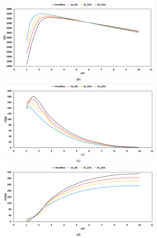 Variation of specific impulse (a), combustion temperature (b), CO emissions (c), and CO2 emissions (d) as a function of the oxidizer-to-fuel ratio, obtained through ProPEP Version 1.0.3.0 software simulations for pure paraffin and paraffin with 8%, 15%, and 25% aluminum.