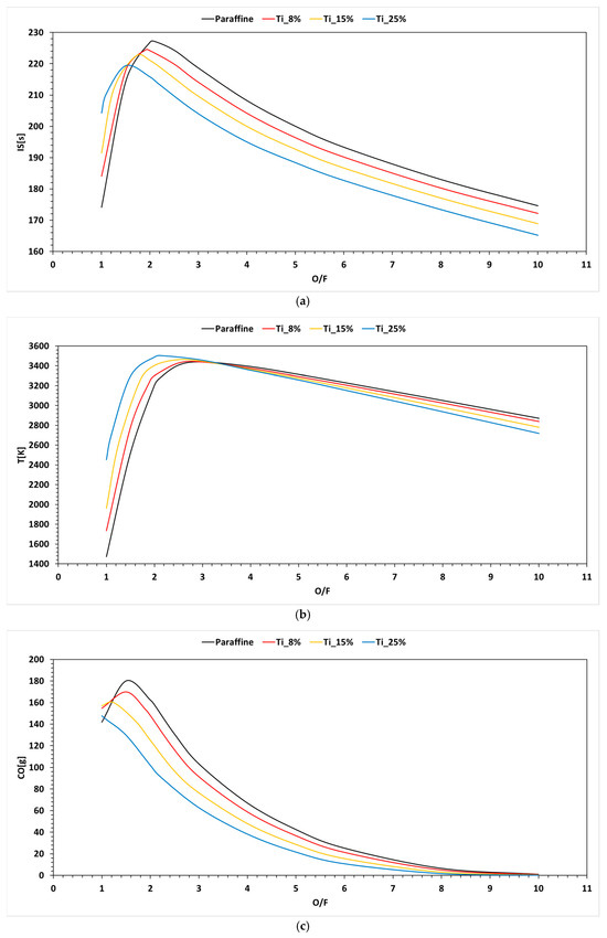 Additionally, a shift in the peak values of specific impulse and combustion temperature toward lower O/F ratios is observed as the titanium content increases. This shift is explained by the energetic contribution of Ti, which reduces the oxidizer demand in the mixture.