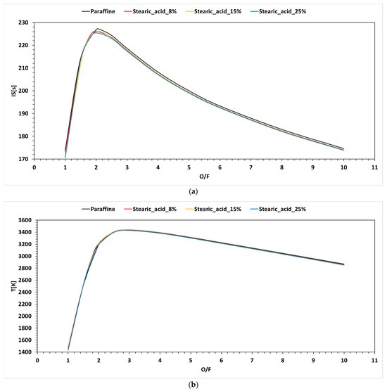 The combustion temperature is nearly identical across all formulations, with a maximum value of ≈3440 K, also in the O/F ≈ 2.2 region. Stearic acid does not provide additional energy beyond what paraffin already contributes, resulting in nearly overlapping thermal behavior.