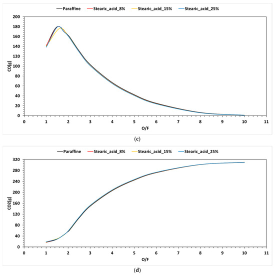 CO2 emissions in the region of maximum specific impulse are in the range of 195–198/100 g, at O/F ≈ 2.2, very close to those of pure paraffin. Since stearic acid introduces additional carbon, a slight increase in CO2 emissions is expected at higher concentrations, but this effect is minimal.