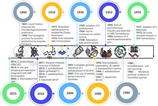 After the oil crisis in 1973, there was a global interest in reducing the dependence on fossil fuels, so fermentative processes for alcohols, especially ethanol, using renewable and agricultural resources grew significantly in countries like the United States and Brazil [78]. Consequently, at the beginning of the 2000s, ABE fermentation attracted the attention of researchers in the framework of sustainable development, as this method can be carried out using renewable sources and represents a promising opportunity to reduce the dependence on fossil fuels [79]. On the other hand, due to the current high production costs, manufacturers tend to focus on the development of chemical applications of higher economic value; for example, butanol can be used for the manufacturing of a wide range of polymers and plastics, and as solvent in paintings and chemical stabilizer [80]. Figure 1 shows the most remarkable events in biobutanol’s production history.