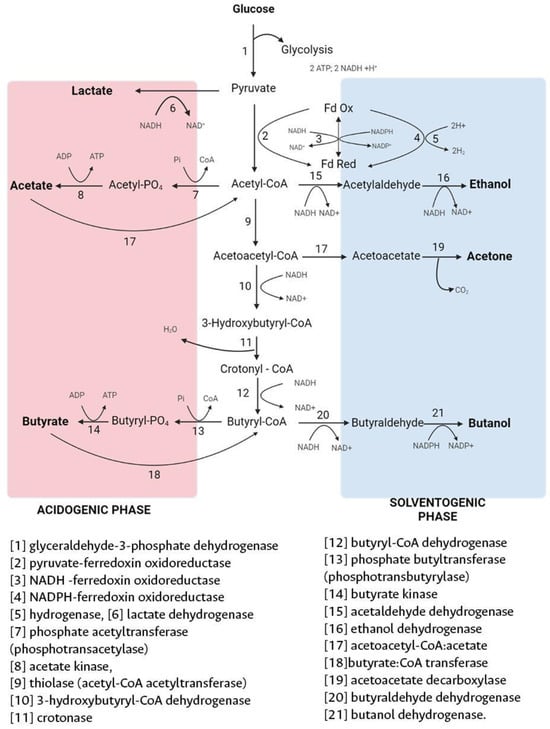 Solventogenic bacteria belonging to the Clostridium genus, including C. pasteurianum, C. acetobutylicum, and C. beijerinckii, are widely utilized for the biological synthesis of butanol. These anaerobic bacteria possess similar metabolic pathways capable of fermenting a broad range of carbon substrates, such as disaccharides (sucrose, cellobiose, lactose, etc.), pentoses (xylose and arabinose), hexoses (glucose, galactose, and fructose), and starch fuels [79]. In ABE fermentation, Clostridium acetobutylicum ATCC 824 (the most investigated organism in this respect), the same strain isolated by Weizmann in the early 20th century, predominantly produces three types of compounds: solvents (acetone, ethanol, and butanol), organic acids (acetate, lactate, and butyrate), and gases (carbon dioxide and hydrogen) [137,138]. Consequently, ABE fermentation is characterized by two distinct phases: acidogenesis and solventogenesis [137]. Figure 3 illustrates a typical metabolic pathway for solvent-producing clostridial bacteria, highlighting the sequence of metabolites and enzymes involved. During acidogenesis, the bacteria undergo exponential growth, utilizing glucose for biomass generation and producing acetic and butyric acid as byproducts. The synthesis of these acids is essential for ATP generation, which is necessary for cellular metabolism [139]. Subsequently, in the solventogenesis phase, triggered in response to the high acid concentration in the environment [78], acetate and butyrate are re-assimilated as substrates for solvent biosynthesis, leading to a cessation of bacterial growth [140]. The primary product of this stage is butanol, along with a mixture of acetone and ethanol, with a typical molar ratio of 6:3:1, respectively. The solvents affect the bacterial cell membrane, and once the concentration of butanol and other products reaches a certain level (>13 gL−1), bacterial metabolism is inhibited [139,141].