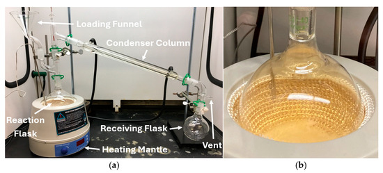 Photos of distillation: (a) Glassware orientation for loading of reactants; (b) Orange-colored gas above the reactants at start of distillation.