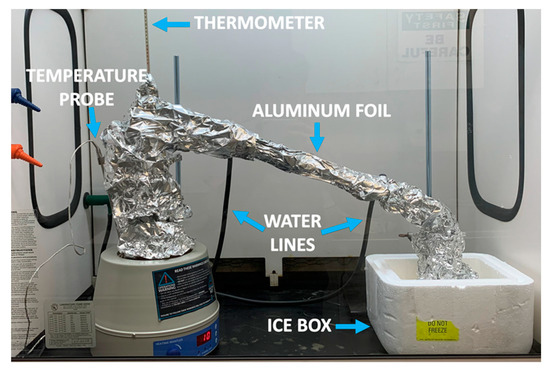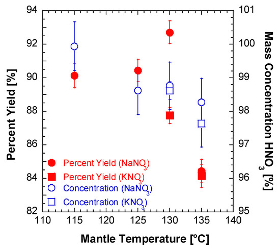 For operator safety, the distillation process was performed under a fume hood. The best heating mantle and endpoint temperatures were evaluated first to make the most yield and concentration of the product solution. In the reaction flask, which laid in the heating mantle (shown in Figure 1), excess H2SO4 was combined with a nitrate salt and agitated with a stir bar to dissolve the salt. This helped the reactants heat uniformly. The H2SO4 was acquired from the supplier Alfa Aesar (CAS #7664-93-9). Sodium nitrate (NaNO3) and potassium nitrate (KNO3) were selected as nitrate salts. The salts were supplied by Sigma Aldrich (St. Louis, MO, USA); NaNO3 (CAS #7631-99-4) and KNO3 (CAS #7757-79-1). The reaction equation is provided in Equation (1):