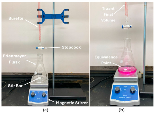Photos of the titration setup to determine concentration: (a) Initial; (b) Endpoint.