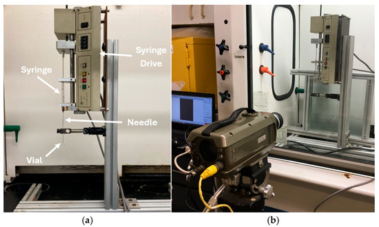 To perform the experiment, a 250 µL Hamilton 700 Series syringe equipped with a 20 gage, 50.8 mm needle was attached to an Antek 735 syringe drive. The syringe drive was operated using a custom LabVIEW program. When initiated, a single drop of TMEDA with a fixed volume (6.5 μL), was released 50 mm from the needle tip to a 100 μL pool of WFNA below. The syringe and syringe drive made for consistent evaluation of TMEDA droplets into WFNA and a syringe-type apparatus was common among droplet testing [11,25,26]. The consistent volume of each TMEDA drop corresponded to the volume at which the weight of the drop of TMEDA overcame the surface tension attaching it to the needle tip. The volume of the WFNA pool varied to compare ignition delay times. A Phantom v310 camera equipped with a 50 mm lens operating at 5000 frames per second was used to record the fuel drop being releasing from the syringe needle up to and through contact with WFNA and subsequent combustion. The entire apparatus and experiment, aside from the Phantom v310 camera, was housed inside a fume hood to contain the combustion byproducts and reduce air movement that may prematurely detach the fuel drop from the tip of the needle. After each experiment, the high-speed video was reviewed obtain the ignition delay time. For this study, the ignition delay time was identified as the time from the first contact of the TMEDA drop with the WFNA pool (t0) to first light when an ignition kernel appeared (tign) as defined in other hypergolic propellant droplet work [24,25,27,28,29]. A photograph of the ignition delay drop test system and high-speed cinematography setup is shown in Figure 4.