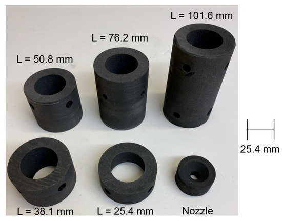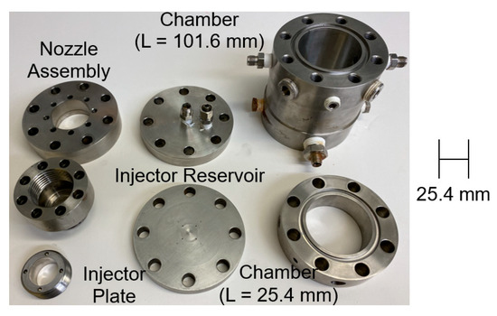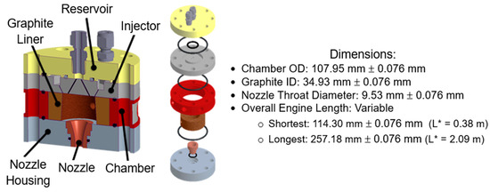 In evaluating TMEDA as an alternative bipropellant rocket engine fuel the next step after droplet testing was to study TMEDA/WFNA combustion characteristics in a bipropellant rocket engine. To accomplish this, numerous bipropellant injector assemblies and a common, cylindrical combustion chamber assembly were designed and fabricated. The cylindrical shape provided an axisymmetric combustion chamber. The injectors, chamber assembly, and nozzle assembly were constructed from 316L corrosion resistant stainless steel (CRES). The material’s high strength allowed the engine to safely handle combustion products beyond 17.24 MPa psi. This value was determined by using a factor of safety of two on the predicted internal hoop stress for a maximum chamber pressure, PC, of 3.55 MPa. The combustion chamber outer diameter (OD) was 107.95 mm (with wall thickness of 23.98 mm). The chamber was fabricated with multiple access ports. These ports were used for pressure transducers (PT) to determine the instantaneous pressure in the combustion chamber as well as for gaseous nitrogen (GN2) for pre- and post-test purging. A cylindrical, cartridge-loaded medium-grade extruded graphite liner was placed inside the combustion chamber to house the combustion event and thermally protect the outer, metallic chamber walls. The graphite liners were maintained at a constant inner diameter (ID) of 34.93 mm and varied in length (L) to evaluate the effects of characteristic length (L*) on c* efficiency (ηc*). L* was initially selected at 0.38 m. Until empirical hot-fire data could be gathered and without knowing the combustion characteristics of TMEDA/WFNA in an engine, this initial L* value was selected based upon heritage liquid bipropellant rocket engines [4,5] and an existing combustion chamber [30]. Iso-molded fine graphite nozzle inserts were designed with a throat diameter of 9.53 mm in an atmospheric hot-fire environment (i.e., no expansion nozzle) to maintain a similar PC under similar mass flow of the reactants as well as limit the number of experimental parameters being evaluated in the test matrix. A schematic, exploded-view model can be seen in Figure 5.