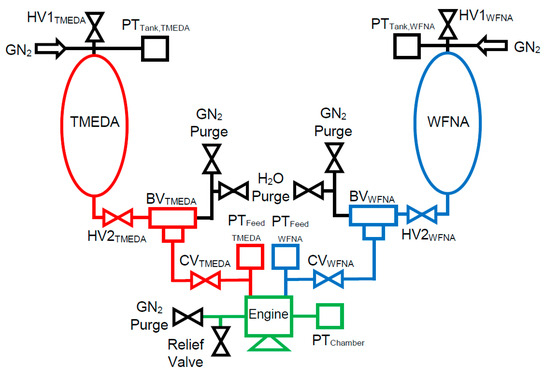 Schematic of TMEDA/WFNA experimental bipropellant rocket engine feed system.
