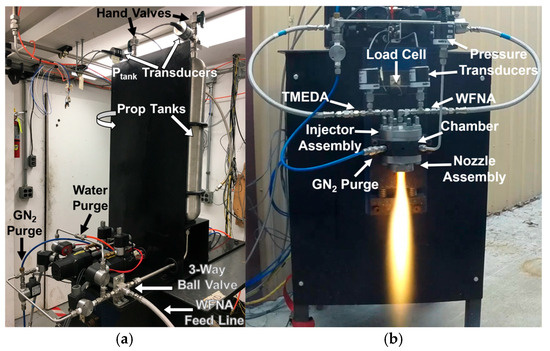 Photo of TMEDA/WFNA experiment: (a) pressure-fed fluid delivery system; (b) hypergolic bipropellant rocket engine.