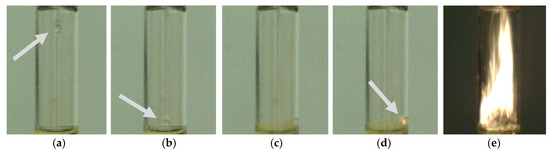 A series of photos showing the advancement of a droplet test to measure the ignition delay time of TMEDA/WFNA is shown in Figure 14. The arrows provided show the TMEDA droplet entering and contacting the WFNA pool (Figure 14a,b) and the point of first light (Figure 14d). The time to flame propagation was +21.0 ms after TMEDA contacted the WFNA pool, with tign = +16.6 ms.
