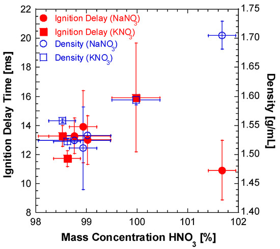 Ignition delay time and density for NaNO3 and KNO3 with HNO3 mass concentration.