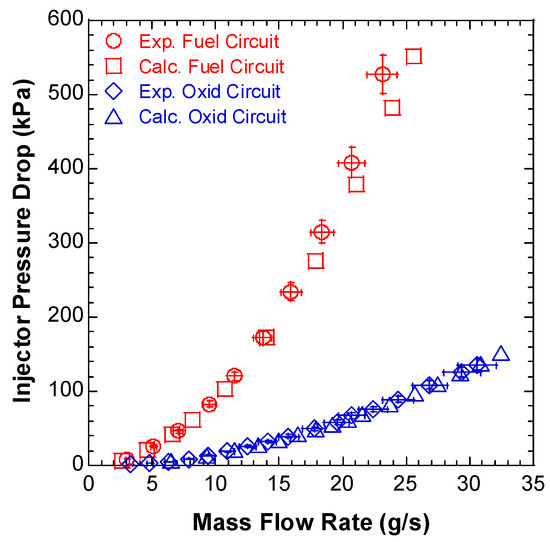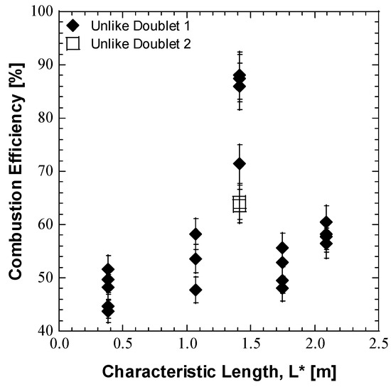 The experimental MR and ϕ were then used with NASA-CEA code to determine the theoretical maximum c* value for the conditions of each hot-fire test [33]. Finally, the experimental c* value was evaluated against the theoretical c* value to give the ηc* of the experiment using Equation (4).
