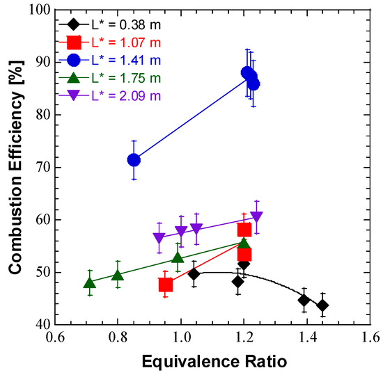 From the experimental results displayed in Table 3, it was observed that by increasing L*, the additional volume provided increased residence time (stay time) for the reactants to mix, leading to more complete combustion and an increase of over 30% in ηc* for some ϕ. For example, a maximum ηc* of 88.0% at a PC of 0.96 MPa was recorded for an L* of 1.41 m with a ϕ of 1.21. For similar ϕ (ϕ = 1.20), a slight decrease in L* to 1.07 m dropped ηc* to a maximum of 58.2% while a slight increase to 1.75 m (ϕ = 1.20) decreased the ηc* to a maximum of 55.6%. This indicated that while increased volume helped reactant mixing and increased combustion performance to a certain point, beyond an optimum L* value increased length resulted in a drop in ηc* from the excess volume and heat loss, which corresponded well with other hypergolic reactant mixtures L* outcomes [4,5].