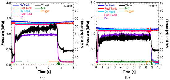 Pressure, F, and MR traces for TMEDA/WFNA experiments: (a) Test 31; (b) Test 34.