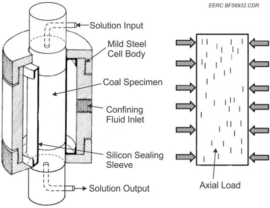 The silicone sealing sleeve was loaded into the Hoek cell and the end caps screwed into place. The assembled Hoek cell was then filled with distilled water that filled the void space between the gasket and the Hoek cell and provided the confining pressure. The prepared coal plug was then inserted into the silicone sealing sleeve in the Hoek cell with the upper and lower platens placed at either end. Once the platens were in place, the Hoek cell was then loaded into the load frame. The platens and Hoek cell were then centered so that the axial load was applying pressure directly through the center of the platens. The axial load was then applied to the platens using nitrogen gas, which pushed a plunger down to the platens. A load sensor on the end of the plunger accurately measured the pressure being applied to the cell in the form of psi. Next, confining pressure was applied to the sample by pumping water into the Hoek cell from the confining pressure pump. Once the confining pressure stabilized, the flow rate on the solution pump was manually set. The confining pump was controlled by a computer, and the injection pump and mass balance data were recorded through the computer.