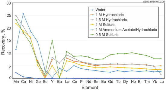 Stronger acid is not necessarily the key to recovery of REEs and minerals from coal, as shown by the higher recovery percentage from a lower-strength 0.5 M H2SO4 compared to stronger 1.5 M HCl. The use of the 0.5 M H2SO4 solution was able to recover the most out of the solvents tested, with an average recovery of the REEs of 8.9%. While this recovery average was less than the >50% recovery of REEs in the work done by Laudal [9] with 0.5 M H2SO4, it shows that it could hold potentially economic amounts of recoverable REEs and other critical minerals. The limited number of tested samples using H2SO4 and HCl as solvents leaves to be determined the true significance in the differences in recovery. Sc was the only element that did not have any significant recovery under any of the testing matrix parameters, except for the ammonium acetate preflush prior to HCl. Sc is one of the highest-value REEs. Alternatively, the recovery rate of the remaining REEs was much lower with the ammonium acetate preflush as opposed to the single-solution tests. REE extraction from coals and coal by-products and subsequent retention of the REEs in the aqueous phase are sensitive to the pH of the solution, and each coal system will need a tailored approach to determine acid type and strength for best results.