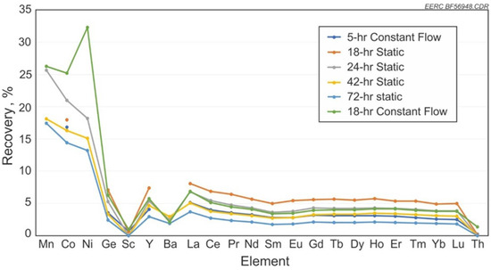 Test results for static contact of the solution 1 M HCl compared to flow-through contact and time are shown in Figure 5. As discussed previously, the best recovery was at 18 h at a static contact. Constant flow of HCl for 18 h shows slightly less recovery of REEs but an increase in Co and Ni recovery compared to the static tests.