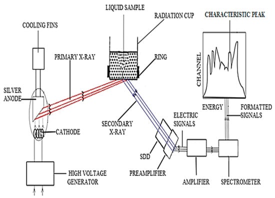 Below is Figure 1, a diagram representing the system of energy-dispersive X-ray fluorescence device. The red-coloured rays from the silver anode to the liquid sample indicate primary X-rays. The blue-coloured rays from the liquid sample to the silicon drift detector, SDD, detector is the fluorescence sample (secondary X-rays) emitted by the atoms of the liquid. The corresponding electric pulses from the emitted fluorescence are transformed to characteristic energy peaks of the atoms. The intensity of each peak is computed and hence converted to elemental concentration in parts per million, ppm.