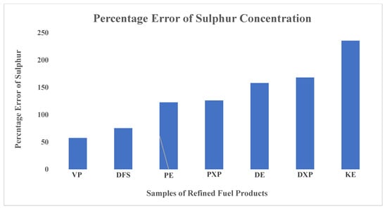 From the seven tables, the elemental concentrations of the non-metals identified were relatively lower compared to the metals. The concentrations of the element S in each fuel sample are between 20.0–50.0 ppm, which is slightly above the ultra-low level of 10.0 ppm per the standards of the Environment Protection Agency of the United States for fuels for on-road engines. On average, fuel sample KE recorded the highest sulphur concentration and sample VP the least. From Table 3, the sulphur concentration in fuel sample KE is relatively higher compared to the rest. This is because kerosene fuel products usually have sulphur content much higher than petrol and diesel products. The study confirmed that sulphur concentration in on-road diesel fuels is usually more than in petrol fuels. From the results it is revealed that the concentration of sulphur in fuel sample DE (diesel) is approximately 1.16 times greater than sulphur in sample PE (petrol) even though both are imported by the same oil-marketing company, Total Energies Ghana Limited. Also, a similar effect happened between the fuel samples DXP (diesel) and PXP (petrol). However, there is a strong correlation between sulphur concentration in fuel sample PXP and PE, even though both are petrol products from different oil-marketing companies. Similarly, the sulphur concentration in sample DXP is approximately 1.02 times greater than that of sample DE. These slight anomalies may be because the major oil-marketing companies of Ghana import refined petroleum fuels from different Asian and European countries. Hence, on-road fuels for engines are acquired from any available source per the prevailing market conditions. Considering 10.0 ppm as the internationally accepted standard concentration of sulphur in on-road refined fuels, the estimated percentage error for the fuel samples—VP, DFS, PE, PXP, DE, DXP and KE—are 57.5, 75.4, 122.6, 126.2, 158.1, 168.1 and 235.5%, respectively, in ascending order. Figure 2 is a bar graph showing the magnitude of the percentage error of sulphur concentration estimated for each sample.