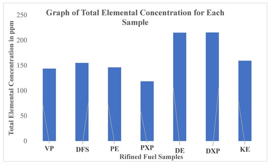 Studies in petrology have proven that metal compounds of alkali, alkaline earth, semimetal, transition and base metal in refined petroleum fuels are ash-producing agents [19]. Salted compounds of these metals in refined fuels produce undesired results in the combustion chamber by causing a high-temperature corrosion effect on burner tips and refractories. The higher the ash-forming constituents, the greater the fouling deposits in the combustion equipment and vice versa. Based on the results for the diesel samples, DFS recorded an approximate total average elemental concentration of 155.0 ppm while DE and DXP recorded 215.0 and 215.3 ppm, respectively. It is seen that the total average concentrations for samples DXP and DE are most comparable, however, the individual elemental concentrations are not the same. Among the petrol products, samples PXP, VP and PE recorded approximate total average concentration values of 118.5, 143.6 and 146.1 ppm, respectively. Hence, the fuel sample PE recorded the highest elemental concentration among the petrol products consumed in Ghana. However, the fuel sample KE of kerosene product recorded an approximate significant value of 159.3 ppm, which represents lesser impurity content compared to diesel samples. Figure 3 is the bar graph showing the impurity levels based on the total elemental concentrations present in the refined fuel samples.