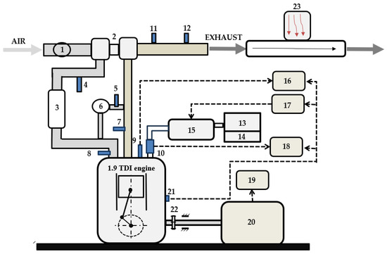 The test bench consists of a VW-Audi 1Z 1.9-L TDI diesel engine equipped with an electronically regulated distribution fuel pump. It is a 4-cylinder engine with a torque of 182 Nm at 2000 rpm. It operates on a single injection strategy with a piston stroke of 95.5 mm. The schematic representation of the test equipment is provided in Figure 1. Further engine specifications are available in details in some of the previous research papers [31,32,33].