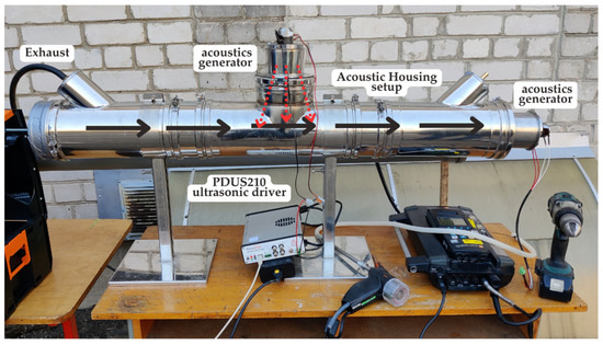 Engine exhaust, which was directed through the black tube presented in Figure 2, is then passed through the in-house built acoustic housing setup, where the particles and other emissions are measured and recorded under different test conditions, as presented in Figure 1 and Figure 2. The red lines indicate the acoustic waves imposed on the exhaust and the black lines represent the flow of exhaust gases through the setup. The acoustic housing setup consists of longitudinal chambers, emission measuring equipment, acoustic generators controlled by a computer and PDUS210 ultrasonic driver, as further presented in Figure 2.