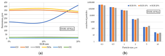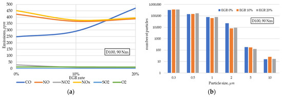 As presented in Figure 3b, at 60 Nm load, a 3% increase in 0.3 μm size is observed with an increase in the EGR rate from 0 to 10%. But with a further increase in EGR to 20%, it was found that the number of particles of sizes 0.3–1 μm was found to decrease with an average increase of 48% in the number of particles between the size range of 2 and 10 μm. Also, at higher loads, with an increase in exhaust recirculation to 10%, 0.3 and 0.5 μm particles increase in number. Additionally, as presented in Figure 4b, a substantial increase in 10 μm particles are observed. In contrast to the trend observed at 60 Nm, with increase in exhaust recirculation to 20%, increase in particles are observed with a size range of 0.5–2 μm. This shift in the particle size distribution to a larger size is consistent with recent empirical findings [35,36,37].