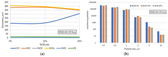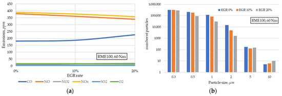 For RME100, at a lower load of 60 Nm, with a rise in the exhaust recirculation to 10%, the 0.3 μm sized particles are found to increase as observed for diesel fuel. When the exhaust recirculation is increased to 20%, particles in the range of 0.3 to 2 μm are observed to have an average fall of 41% combined with an increase in particles of sizes 5 and 10 μm at 18% and 67%, respectively, as presented in Figure 5b. At a higher tested load, when the recirculation rate is increased to 10%, a significant reduction in large particles is observed, along with a considerable rise in 0.5–2 μm sized particles. With further increase in the recirculation rate to 20%, particles between the size range of 1 to 5 μm are found to decrease at an average of 21% with an observable increase in particles less than 1 μm, as shown in Figure 6b. The influence of EGR on RME fuel causes small particles to collide and agglomerate. This results in the formation of large-sized particles and this concentration can be positively influenced by the oxygen content in the fuel [43].