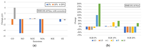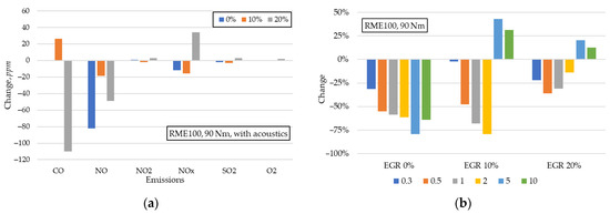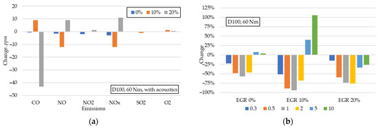 There is a variation in other emissions in the presence of acoustics, but the changes are either too small to consider or do not follow a specific pattern. However, the influence of acoustics on particle emissions from RME is significant. In contradiction to what was observed for diesel, RME100 is observed to have the highest agglomeration at lower loads and no exhaust recirculation. The combination of the increase in large-sized particles with the reduction in small-sized particles proves that the particles collide with the presence of acoustics and are agglomerated. The particles of 5 μm size increase by 100% and 10 μm sized particles increase by 20%, as shown in Figure 9b. RME have a higher chance of particle agglomeration at lower engine load due to lean mixture combustion [43].