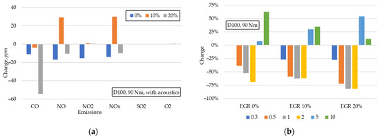 Acoustic waves can induce turbulence and disrupt the natural flow of exhaust gases passing through the acoustic setup [28]. The impact of acoustic waves on particle emissions is a widely researched area. In this article, the influence of acoustics is combined and studied in terms of EGR rate and the increased influence on particle emissions. Although there is no primary research or effective evidence proving the direct impact of acoustics on other gaseous pollutants, the observed results are presented for further research.