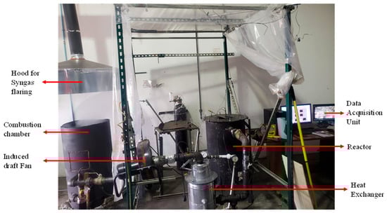 The oak and pine pellets were commercially obtained from Lowe’s Home Improvement store in Rolla, Missouri, USA. The refuse-derived fuel (RDF), made up of pre-processed combustible materials from municipal waste, was supplied by Idaho National Laboratory, USA. These pellets were introduced into a laboratory-scale downdraft gasifier equipped to operate under controlled temperature conditions, with the combustion zone maintained at an average of 850 °C. The downdraft reactor design facilitated sequential stages of drying, pyrolysis, oxidation, and reduction, with a residence time of 45–60 min, producing stable, high-carbon biochar. Air was supplied as the gasifying agent through an induced draft mechanism, with the superficial velocity regulated to optimize reaction kinetics and enhance tar reduction. Figure 1 presents a laboratory-scale gasifier with a one-ton-per-day capacity of biochar via downdraft gasification. The gasification process and system configuration have been extensively discussed in prior work and are referenced herein for methodological details [25].