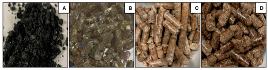 Images of gasified biochar (A), RDF (B), pine (C), and oak (D).