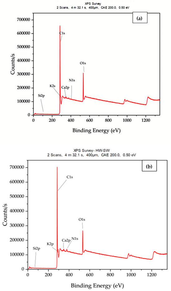 The relevance and reliability of XPS in this context are further supported by previous studies. For instance, Nzediegwu et al. [29] utilized XPS to systematically assess the surface characteristics of various biochars, demonstrating the method’s robustness in quantifying elemental composition, oxidation states, and functional groups. Such analytical precision is indispensable for elucidating the physicochemical properties that govern biochar’s environmental behavior and functional performance. Table 1 shows a summary of the elemental composition and its constituent weight percentage.
