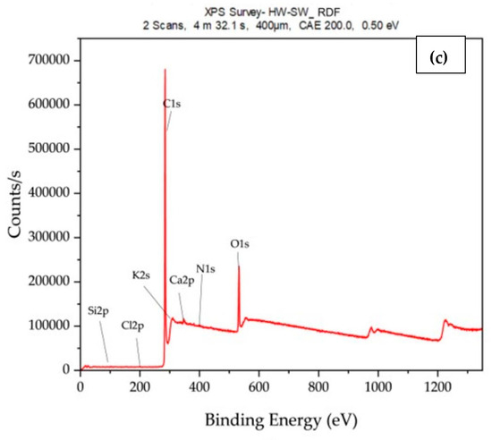 Graph of XPS survey spectrum—HW (a), HW/SW (b), and HW/SW/RDF (c).