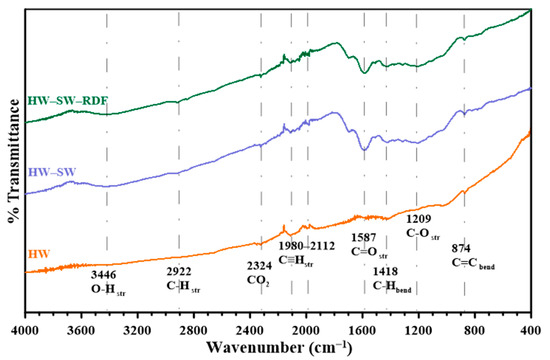 Collectively, FTIR spectroscopy has shown that the addition of RDF alters the biochar’s surface chemistry without fully compromising key functional groups needed for reactivity. While the HW and HW/SW samples possess balanced compositions favorable for catalysis and sorption, the HW/SW/RDF biochar, although chemically active, may require further structural enhancement—such as activation treatments—to reach comparable efficacy [59].