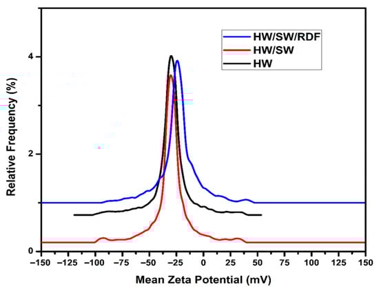 A more pronounced shift was observed in the ternary mixture containing RDF (HW/SW/RDF), where the zeta potential dropped significantly to –24.2 mV. This reduction in surface charge can be linked to the chemical heterogeneity introduced by RDF constituents. The isoelectric point of this sample appears to shift upward, diminishing its net surface charge at neutral pH and weakening its electrostatic repulsion in water. Such a shift implies a less stable dispersion and a greater tendency toward aggregation or sedimentation under environmental conditions.