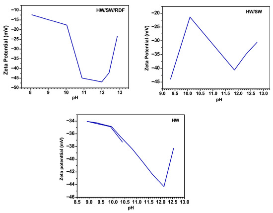 The observed shifts in the pH–zeta potential curve underscore the effect of RDF on colloidal behavior. While HW and HW/SW samples maintained relatively strong negative charges over a broader pH spectrum—supporting robust electrostatic repulsion and colloidal stability—the RDF-containing biochar demonstrated greater sensitivity to pH fluctuations, which could predispose it to aggregation or precipitation in environmental systems. Table 3 presents the comparison table for the three samples and how they changed with pH change [74,75].