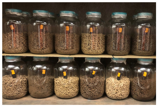 In the second experiment, pellets were tested under dark, temperature-controlled conditions as described in prior work [8]. Glass jars with an approximate volume of 0.47 L were filled halfway with pellets to yield a 50% headspace, with each jar containing approximately 150 g of pellets. The same LASCO CO and temperature sensors used in the ambient experiments were employed in these temperature-controlled experiments. Once sealed, the jars were placed in a dark Fisher Scientific Isotemp Low Temperature Incubator (Model Number 13-987-626, Waltham, MA, USA) set at 22 ± 1 °C, consistent with studies of CO emissions of fuel pellets conducted at or near room temperature [23,27,28,29].