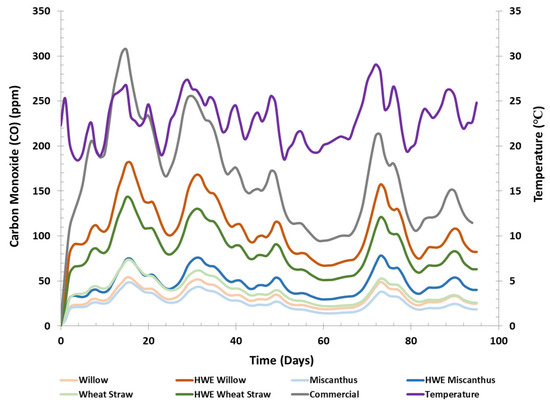 Carbon Monoxide Emissions from LCB, HWE-LCB, and Commercial Pellets in Ambient Conditions (Average Temperature 22.91 ± 2.55 °C).
