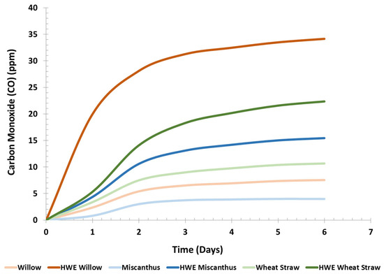 Overall, HWE-miscanthus generated the least CO under both temperature conditions among the HWE-LCB, while HWE-willow generated the most. In examining the xylan and total lignin content of the HWE-LCB (Table 2), HWE-willow had a lower xylan content but a higher lignin content compared to HWE-miscanthus, which had the lowest lignin and xylan content. The xylan-to-lignin ratio of these samples decreased in the following order: HWE-miscanthus (0.441) > HWE-wheat straw (0.414) > HWE-willow (0.312). Theoretically, HWE-willow pellets should have produced less CO, as HWE-willow contained more lignin and less xylan. However, the opposite occurred, and HWE-willow pellets had the highest CO emissions.