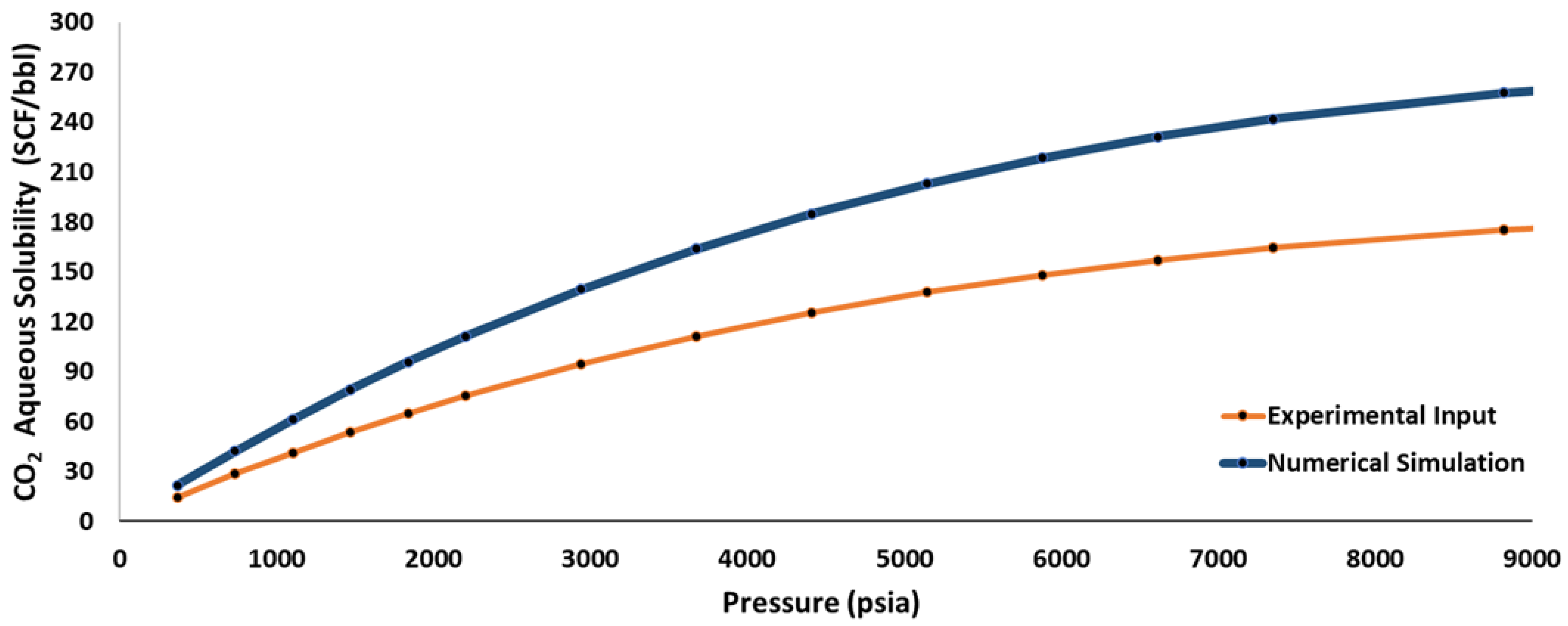 42], on the other hand, showed increasing solubility with pressure. Interpolating for the reservoir condition (5000 psia = 34 MPa, 240 °F = 116 °C) led to an approximately 0.63 mole fraction (solubility), which was reasonably aligned with the estimation of the simulator (CMG-Gems).