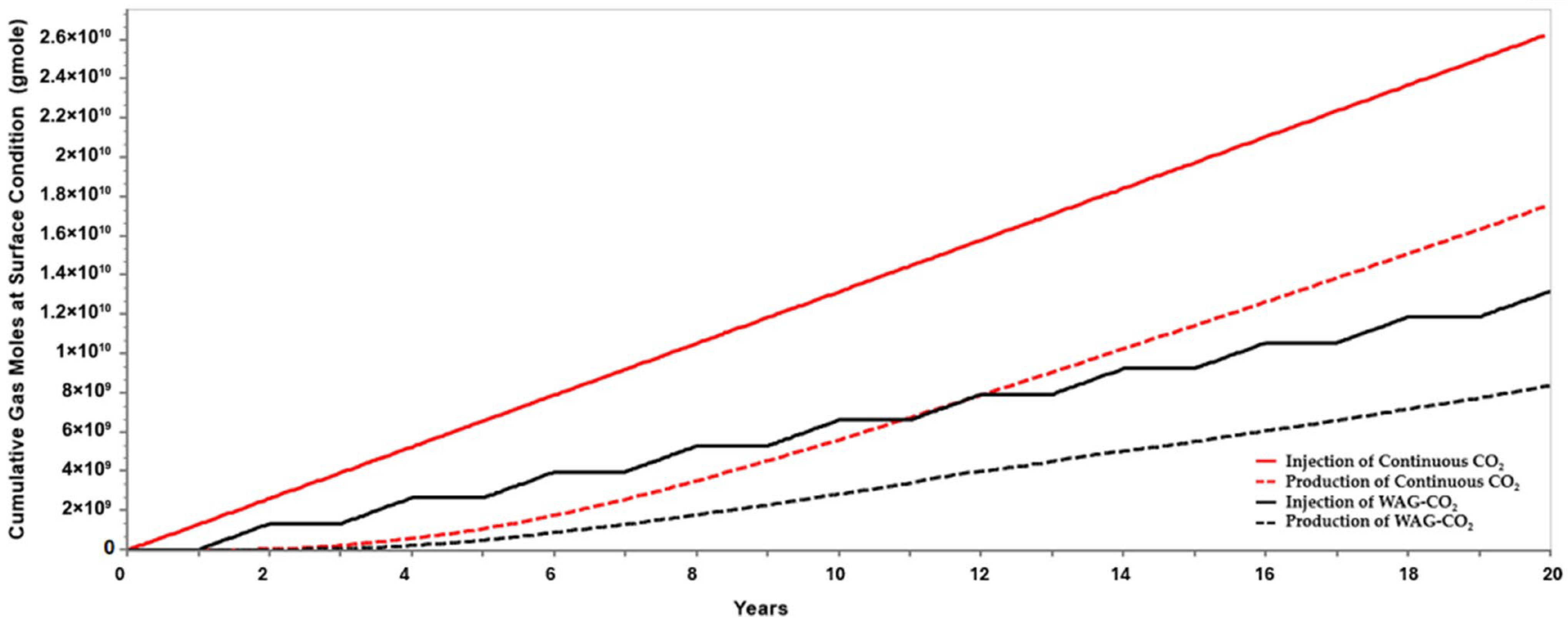 2. In the WAG scenario, the cycle comprised one year of water injection followed by one year of CO