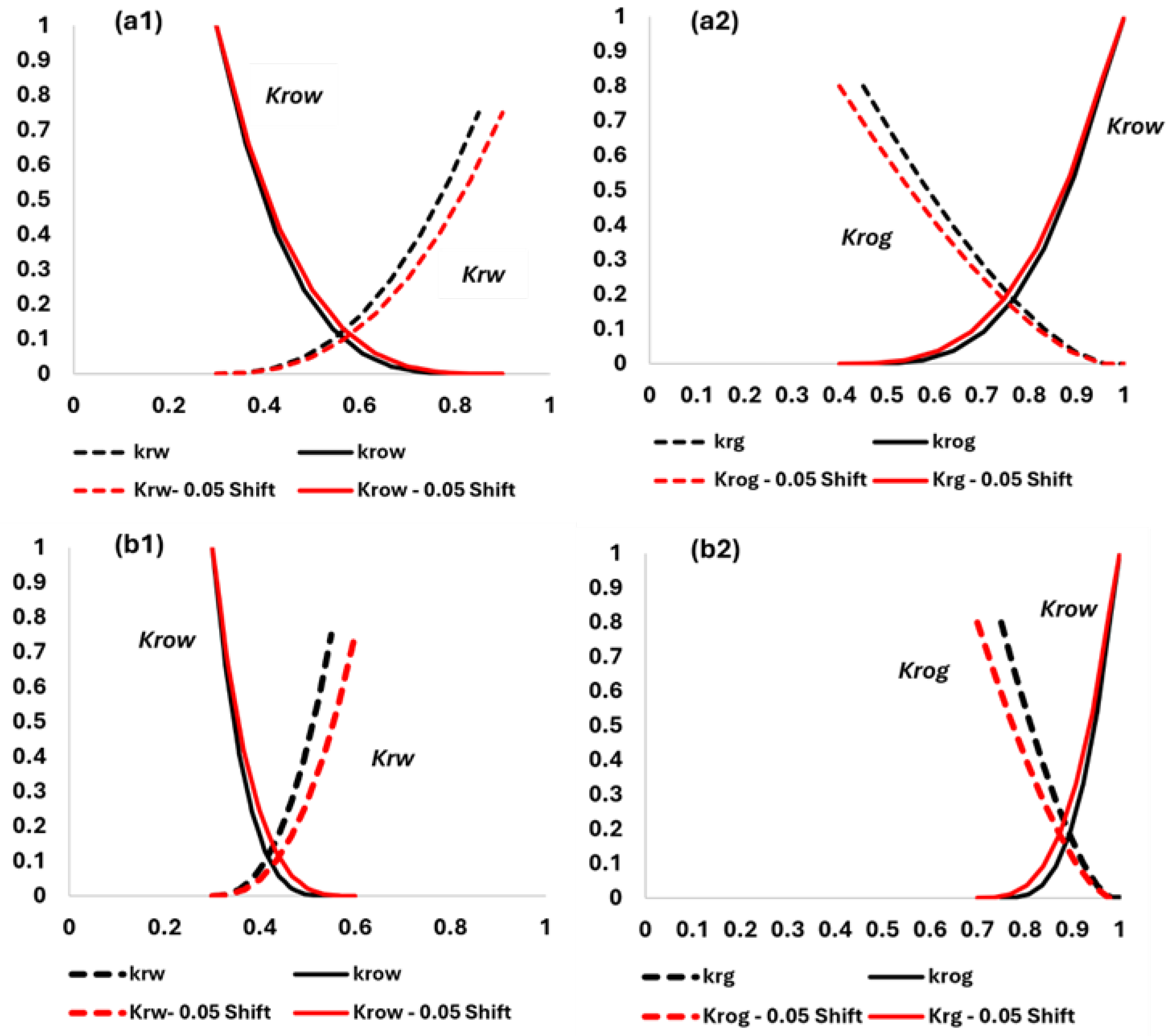 2 effect on relative permeability endpoints for oil–water and liquid–gas systems. The residual oil saturation is assumed to drop from the original 30% to 25% when CO