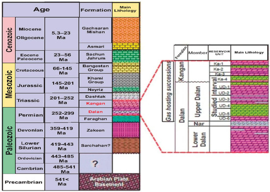 The studied Shanul gas field is located in the Zagros region of Fars province (200 km south of Shiraz) (Figure 1), with Permo-Triassic carbonate reservoirs (Figure 2). The Permian sequence begins with the Faragan Formation, followed by the Late Permian Dalan Formation and the Early Triassic Kangan Formation. These two formations form the main reservoirs of the studied field [12]. Dalan formation is composed mainly of thick gas-rich carbonates [1], with a middle anhydrite unit (Nar formation) containing sour gas [4]. Kangan formation is also composed of carbonates, with a middle more dolomitic part. This field is composed mainly of dolomites and limestone, but evaporites and shale rocks are also present (Figure 2).