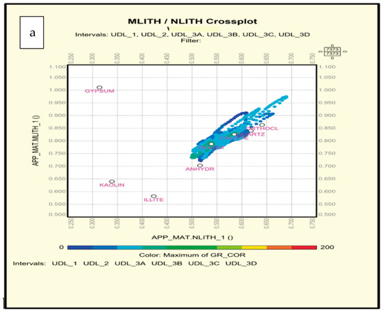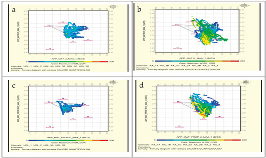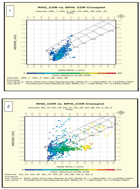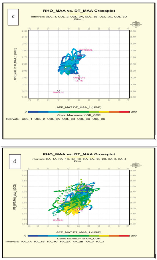 RHOmat-Umat cross-plots. (a) upper Dalan formation in well 4. (b) Kangan Formation in Well 4. (c) upper Dalan formation in well 6. (d) Kangan Formation in Well 6.